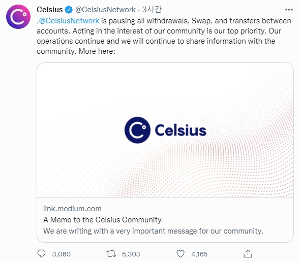셀시우스는 이날 공식 발표문을 통해 "극한의 시장 상황으로 인해 오늘 저희는 셀시우스가 계정 간 모든 인출, 스왑 및 이체를 일시 중지함을 알려드립니다. 우리는 시간이 지남에 따라 철회 의무를 존중할 수 있는 더 나은 위치의 셀시우스를 만들기 위해 오늘 이 조치를 취합니다"라고 공지했다.