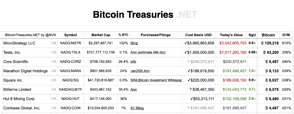 비트코인트레저리스넷(Bitcointreasuries.net)에 따르면 마이크로스트래티지와 테슬라가 각각 보유 하고 있는 약 13만BTC 및 약 4만3000BTC의 가치는 상당히 낮다.