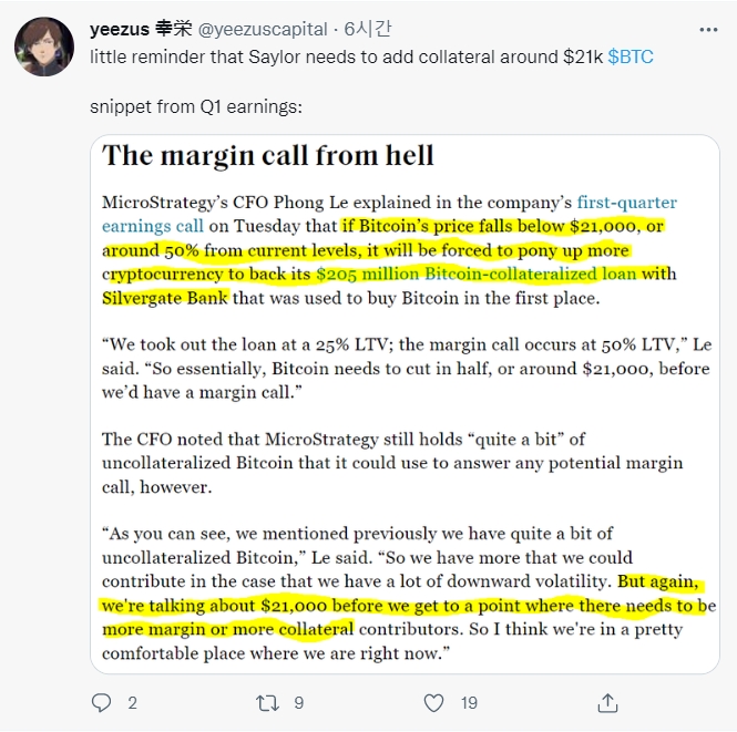 마이크로스트래티지의 경우 상황은 여전히 더 어둡다. 세일러는 비트코인 가격이 2만1000달러에 도달하면 대출을 보충해야 한다.