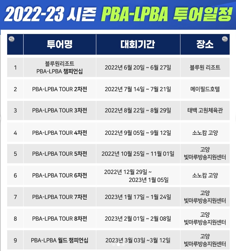 국내 프로당구(PBA·LPBA) 2022-23 시즌 투어 개막전인 블루원리조트 PBA·LPBA 챔피언십이 오는 20일 개막돼 8일간 경주 블루원리조트에서 열린다.