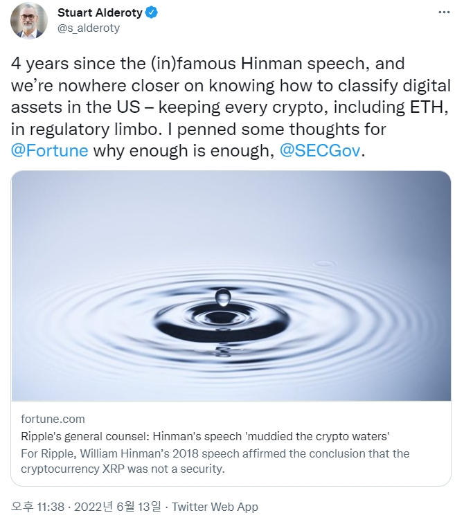 스튜어트 알데로티는 13일 트위터를 통해 리플과 규제 기관 사이에 진행 중인 소송에서 자신의 견해를 공유했다. 그는 모든 암호화폐를 보안으로 취급함으로써 "미국의 모든 암호화폐에 대한 SEC의 공격"의 일부라고 말했다.