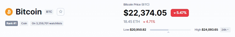 비트코인은 2021년 11월에 기록된 사상 최고치인 6만8789달러에서 66% 이상 하락했다.