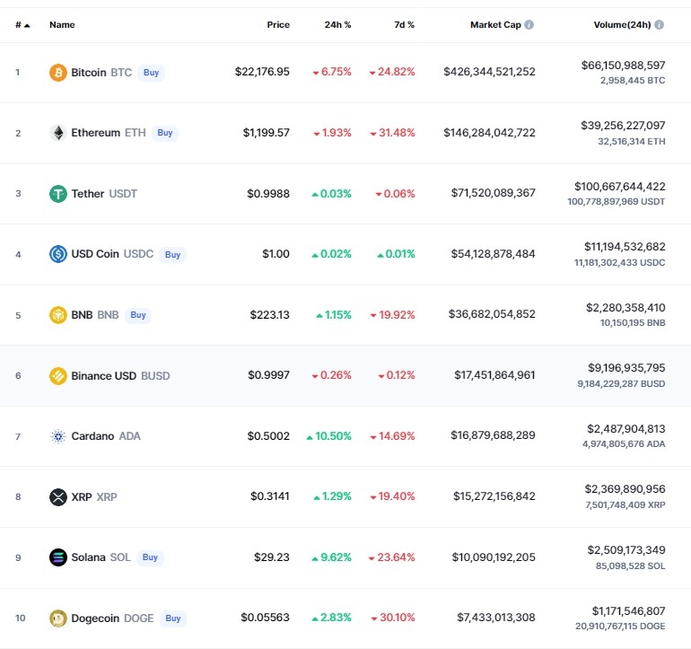 이미지 확대보기14일 오후 10시 2분 현재 코인마켓캡에서 비트코인은 전일 대비 6.75% 하락해 2만2176.95달러에 거래됐다. 이더리움은 1.93% 떨어져 1199.57달러였다.