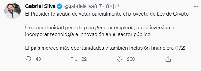 이미지 확대보기법안 초안을 작성하는 데 기여한 가브리엘 실바 하원의원은 이날 트위터에 코르티조 대통령의 조치가 "공공 부문에서 일자리를 창출하고 투자를 유치하며 기술과 혁신을 통합할 기회를 놓친 것"이라고 썼다.