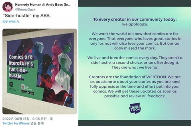 케네디 호만 트위터에 올라온 웹툰작가 폄하 논란을 부른 북미 웹툰 광고(왼쪽), 웹툰엔터테인먼트의 공식 사과문(오른쪽) [사진=연합]