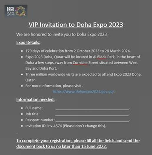 이미지 확대보기공격자는 먼저 ‘VIP Invitation to Doha Expo 2023(2023 도하 엑스포 VIP 초대)’라는 제목의 워드문서 파일(.docx)을 메일 등으로 유포했다. 사용자가 해당 문서를 실행하면 ‘2023 도하 엑스포’의 VIP 초대장으로 보이는 본문이 열린다.
