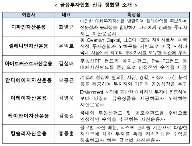 이날 정회원으로 가입된 회사는 디파인자산운용, 셀레니언자산운용, 아이트러스트자산운용, 안다에이치자산운용, 이케이자산운용, 케이와이자산운용, 킹슬리자산운용 등 7개사다.