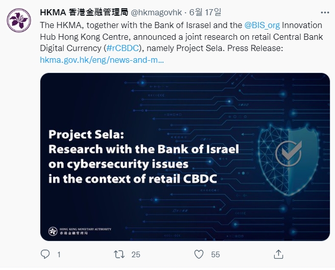 이스라엘 중앙은행이 홍콩금융관리국(HKMA)와 협력해 디지털 통화(디지털 셰켈) 스마트 계약 및 개인 정보 보호를 실험했다. 사진=트위터