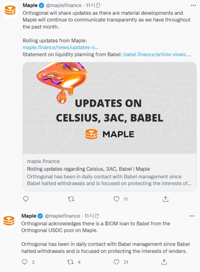 메이플 파이낸스는 이날 트윗에서 "바벨이 출금을 중단한 이후 오터그널은 바벨 경영진과 매일 연락을 주고받으며 대출 기관의 이익을 보호하는 데 집중하고 있다"고 밝혔다.