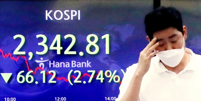 이미지 확대보기22일 한국거래소에 따르면 코스피는 전 거래일(2408.93)보다 66.12포인트(2.74%) 하락한 2342.81에 장을 마쳤다. 지난 2020년 11월 2일 2300.16을 기록한 이후 가장 낮은 수준이다.