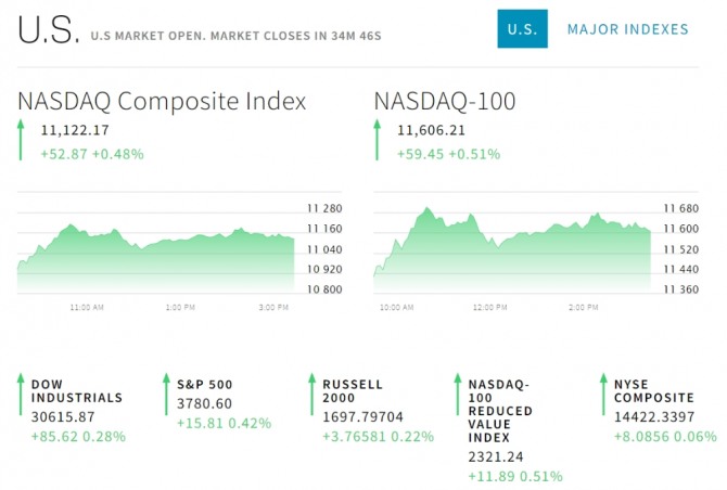 스탠더드앤드푸어스(S&P)500지수는 전장보다 13.12포인트(0.35%) 떨어진 3,751.67을, 기술주 중심의 나스닥 지수는 전장보다 4.54포인트(0.04%) 반등한 11,073.84를 나타냈다.