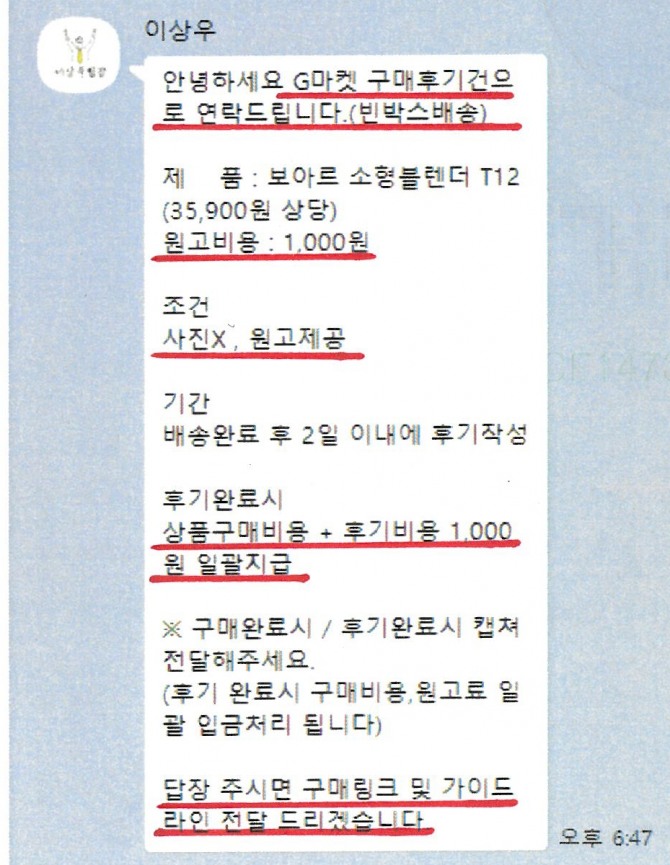 아르바이트생은 개인 아이디와 결제 수단을 이용해 지시하는 제품을 구매하고 후기 작성 대가로 건당 약 1000원 정도를 지급 받았다.