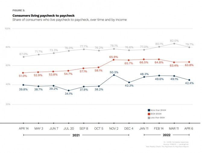 이는 미국 소비자 5명 가운데 3명 정도가 매달 버는 소득을 생계비로 거의 대부분 지출해 여유가 없는 상태에 있다는 뜻으로 가파른 인플레로 근로자들의 실질소득이 감소한 탓이다.