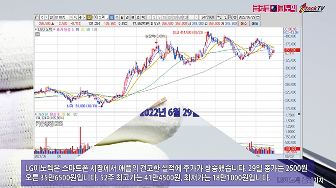 LG이노텍은 스마트폰 시장에서 애플의 견고한 실적에 주가가 상승했습니다. 29일 종가는 2500원 오른 35만6500원입니다. 52주 최고가는 41만4500원, 최저가는 18만1000원입니다.