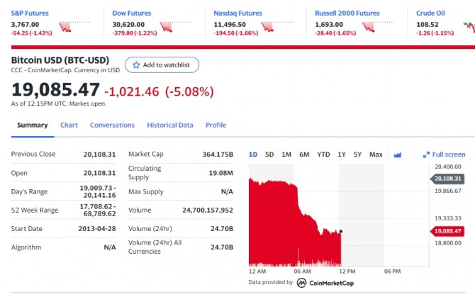미국 뉴욕증시에서 나스닥 다우 주가지수 선물이 크게 떨어지고 있다. 미국 노동부의 PCE 물가지수 발표와 제롬 파월 연준 의장의 강력한 긴축 경고에 흔들리는 모습이다. 비트코인과 이더리움 그리고 도지코인 등 가상화폐는 패닉 붕괴양상을 보이고 있다. 비트코인은 2만달러선이 깨진데 이어 1만9000선도 위협받고 있다. 나스닥 다우 주가지수 선물의 하락은 정규장 뉴욕증시에서 하락 요인이 될 수 있다.