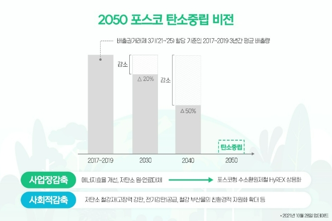 2017~2018년 포스코의 평균 탄소 배출량은 총 7880만t이었으며, 현재 사업장 감축과 사회적 감축 수단을 병행해 2030년에는 20%, 2040년에는 50%를 감축하고, 2050년에는 탄소 중립을 달성한다는 계획이다.