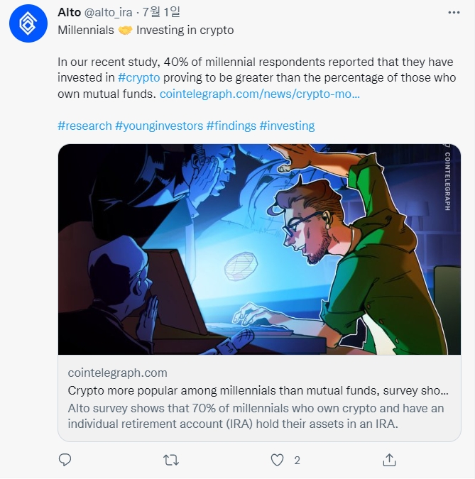 투자 회사 알토(Alto)가 실시한 연구에 따르면 미국 밀레니얼 세대(26~41세)의 40%가 암호화폐를 보유하고 있다. 설문 조사에 따르면 거의 동일한 비율의 사람들이 개별 주식을 소유하고 있다.