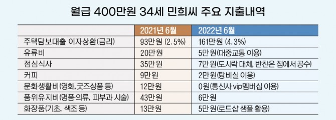 이미지 확대보기이씨가 이처럼 '긴축재정'에 돌입한 가장 큰 이유는 대출이자 부담이 커졌기 때문이다. 그는 지난해 주택담보대출 4억5000만원과 모아 둔 돈을 합쳐 경기도에 아파트 한 채를 장만했다. 하루가 다르게 치솟는 집값에 때를 놓쳐서는 안된다고 판단한 터였다. 하지만 내집 마련에 성공했다는 안도감은 오래 가지 않았다.