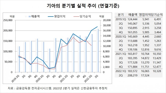 현대차증권 장문수 연구원은 기아가 2분기 반도체 회복 지연과 중국 셧다운에 따른 가동 차질에도 불구하고 우호적인 환율과 인센티브 하락 등으로 시장 컨센서스를 뛰어 넘는 기대 이상의 실적을 기록할 전망이라고 분석했습니다.