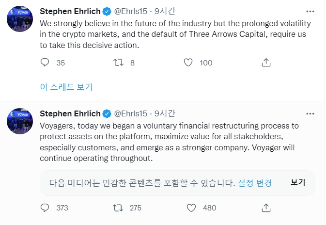 이미지 확대보기스티븐 에를리히(Stephen Ehrlich) 보이저 디지털 최고경영자(CEO)는 6일 아침 트윗에서 "우리는 업계의 미래를 강력히 믿지만 암호화폐 시장의 장기간의 변동성과 쓰리 애로우 캐피털의 디폴트로 인해 결정적인 조치를 취해야 한다"고 말했다.