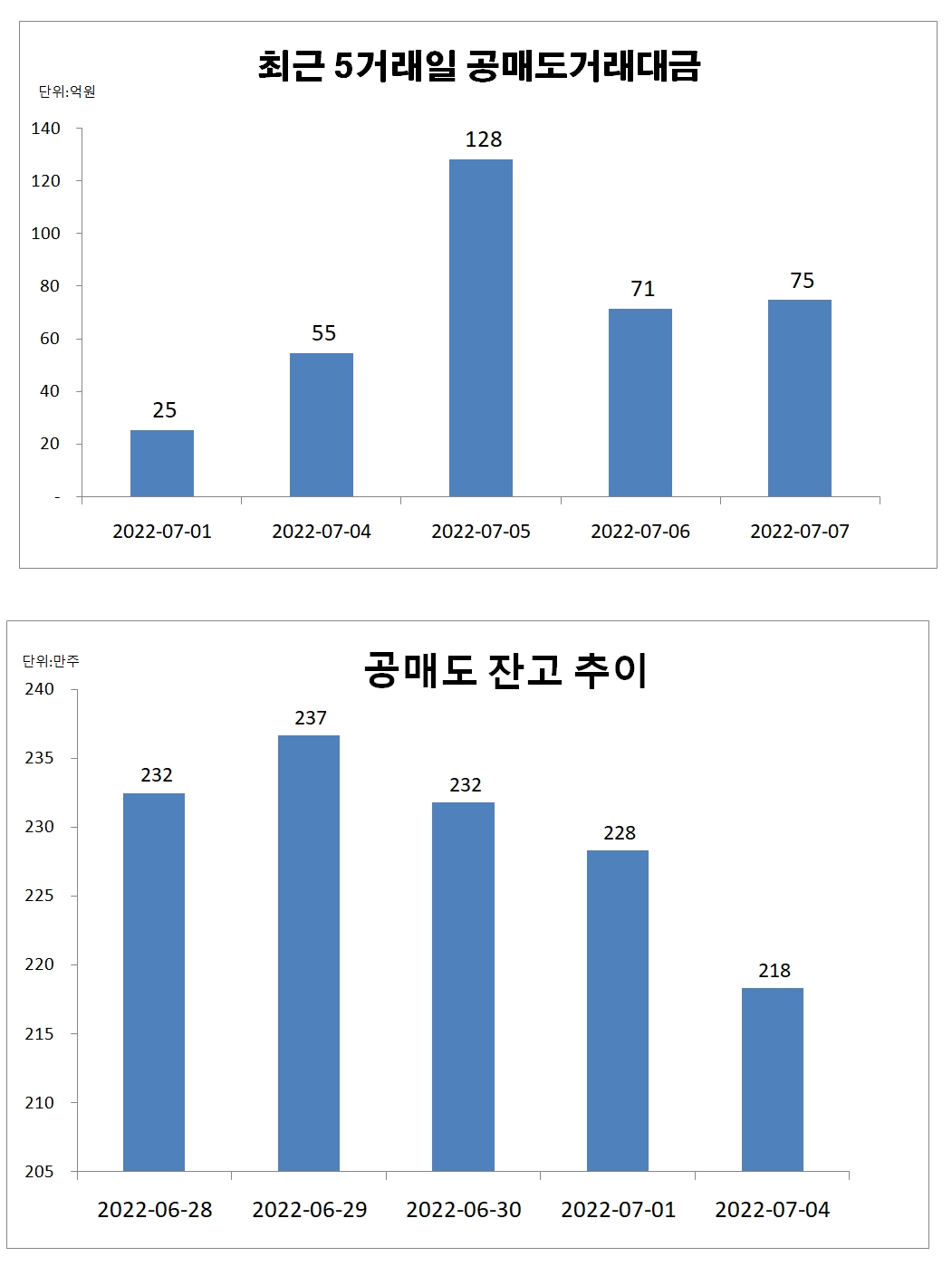 코스닥 시장 공매도 거래량 1위를 기록했고, 공매도 거래대금은 74억원을 기록했다. 이는 지난 6일 공매도 거래대금 71억원과 비교할때 3억원(4.76%) 증가한 것이다.