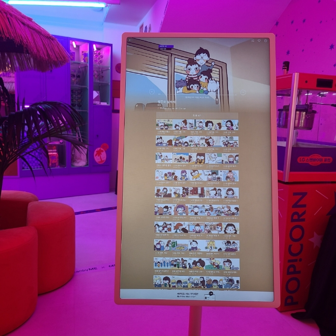 LG 스탠바이미 클럽 내부. 스탠바이미를 가로모드로 두고 OTT영상이나 웹툰을 즐길 수 있다. 사진=정진주 기자이미지 확대보기