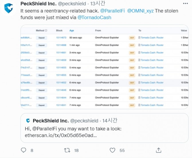 블록체인 보안회사 팩쉴드(PeckShield)에 따르면 이날 공격은 해커가 옴니 프로토콜의 재진입 취약점을 악용했다.