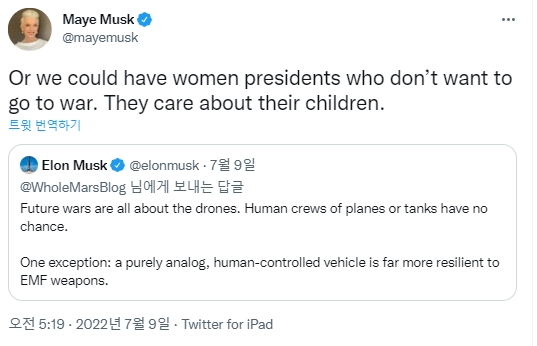 모델이자 영양사로 활동하는 머스크의 모친 메이 머스크는 이례적으로 아들의 트윗에 즉각 댓글을 달고 “아니면 전쟁을 바라지 않는 여성 대통령이 나오는 것도 방법”이라면서 “여성은 아이들을 아끼기 때문”이라고 밝혔다.