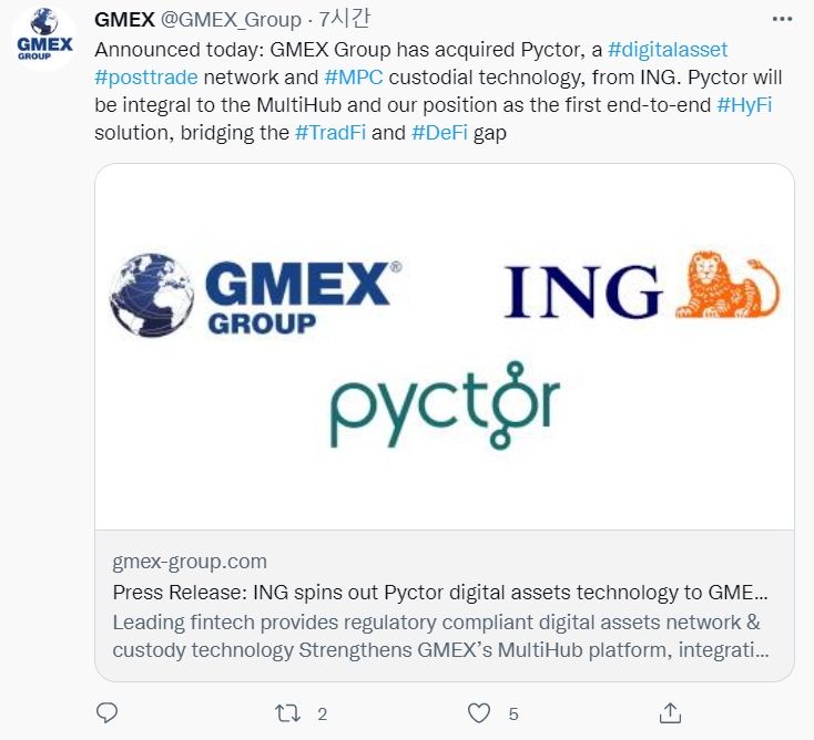 네덜란드의 다국적 은행 및 금융 서비스 기업인 ING 그룹은 디지털 자산 비즈니스 픽터(Pyctor)를 다중 자산 거래 인프라 회사인 GMEX 그룹에 분사했다고 11일 밝혔다. 출처=GMEX 트위터이미지 확대보기