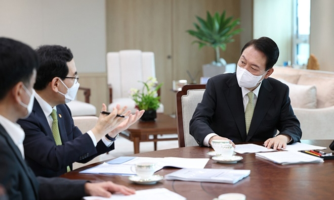 이날 업무보고는 이 장관의 단독 보고로 약 100분간 진행됐다. 대통령실에서는 김대기 비서실장, 최상목 경제수석비서관, 강 대변인만 배석했다. 윤 대통령은 주요 내용을 일일이 메모하며 업무보고를 받았다는 전언이다.