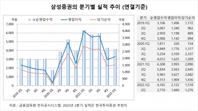 한국투자증권 백두산 연구원은 삼성증권의 2분기 지배순이익이 1276억원으로 시장 기대치를 19% 가량 밑돌고 전분기 대비로는 16% 감소할 것이라고 분석했습니다. 삼성증권의 2분기 순익은 전년동기보다 52% 가량 빠진 수준입니다.