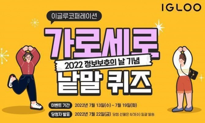 이글루코퍼레이션은 정답을 맞힌 응모자 중 총 100명을 추첨해 배스킨라빈스 파인트 아이스크림 기프티콘을 증정한다. 오는 22일 이글루코퍼레이션 페이스북을 통해 당첨자를 발표할 예정이다.