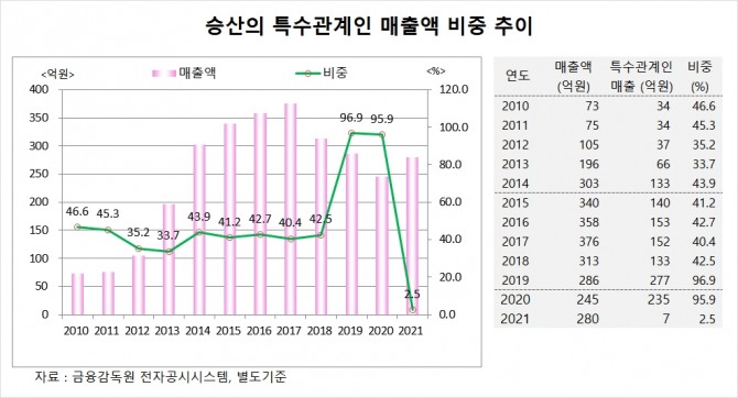 승산의 지난해 별도기준 매출액은 280억원이며 특수관계인과의 거래에서 발생하는 매출액이 7억원으로 일감몰아주기 비중이 2.5% 밖에 되지 않습니다.