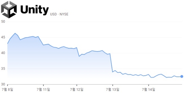 유니티가 아이언소스를 인수한다고 발표하기 전 유니티의 뉴욕증권거래소 주가는 13일 최고 40.8달러(약 5만3007원)를 기록했다. 아이언소스 인수 소식과 포켓게이머의 리치티엘로 대표 인터뷰 기사가 공개된 후 유니티의 주가는 하루만에 32달러선까지 약 21.5% 하락했다.