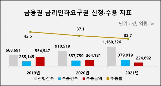 반면 금리인하 요구가 수용된 건은 같은 기간 28만5145건에서 37만9919건으로 33.24% 증가에 그쳤다. 전 금융권의 금리인하요구권 수용률은 2019년 42.6%에서 지난해 말 32.7%로 10% 가량 하락했다. 사실상 금리인하 요구 신청 3건 중 2건이 거부됐다.