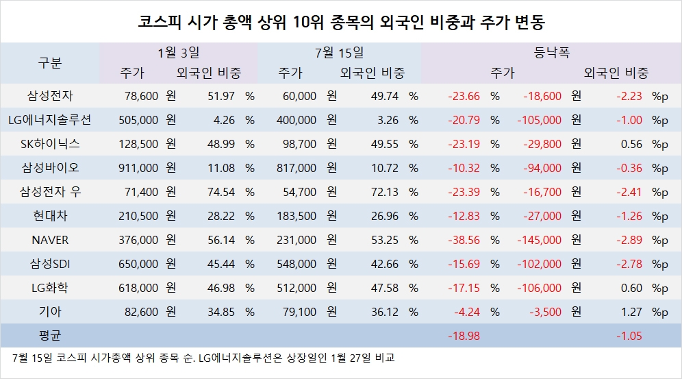 삼성전자 보통주는 연초인 1월 3일 7만8600원에서 7월 15일 6만원으로 23.66% 떨어졌고 외국인 비중은 연초 51.97%에서 15일 49.74%로 2.23%포인트 낮아졌습니다.