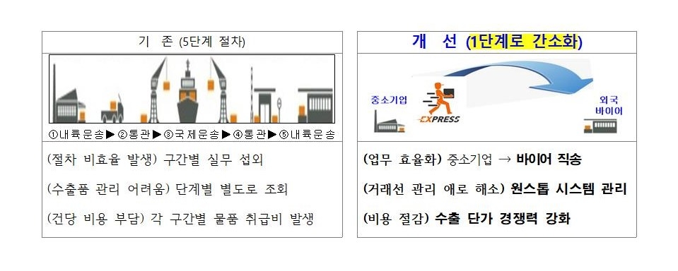 수출 방식은 수출업체가 바이어(구매자)에게 우체국 국제특급(EMS)으로 직배송하는 ‘도어 투 도어’(Door To Door) 방식이다. 기존에는 수출업체가 제품을 내륙운송 후 통관을 거쳐 해상·항공 운송으로 수입국까지 보내고, 통관을 거쳐 수입국에서 내륙운송까지 진행해야 하는 5단계 수출운송 절차로 간소한 것이다.