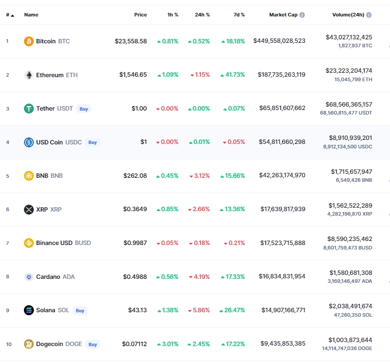 이미지 확대보기21일(한국시간) 오전 7시 27분 현재 글로벌 암호화폐 시세 추적사이트 코인마켓캡에서 비트코인(BTC)은 24시간 전 대비 0.52% 상승해 2만3558.58달러에 거래됐다. 비트코인은 장중 한 때 최고 2만4196달러까지 치솟았다.