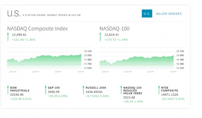 미국 뉴욕증시는 유럽중앙은행(ECB)의 금리 인상에 따른 달러 약세와 테슬라의 주가 급등에 따른 투자심리 완화에 상승했다. 뉴욕증권거래소(NYSE)에서 다우존스30산업평균지수는 전장보다 162.06포인트(0.51%) 오른 32,036.90으로 마쳤다. 스탠더드앤드푸어스(S&P)500지수는 전장보다 39.05포인트(0.99%) 상승한 3,998.95로, 또 기술주 중심의 나스닥 지수는 전장보다 161.96포인트(1.36%) 뛴 12,059.61로 마감했다.