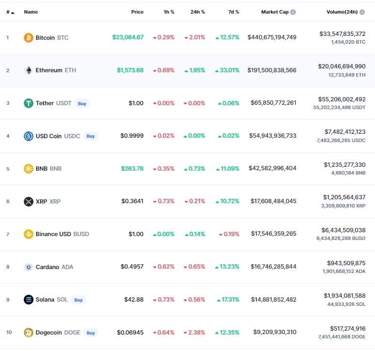 22일 오전 7시 20분 현재 코인마켓캡 기준 시가 총액 10위 코인시황. 비트코인(BTC)은 24시간 전 대비 2.01% 하락해 2만3064.67달러에 거래됐다. 출처=코인마켓캡