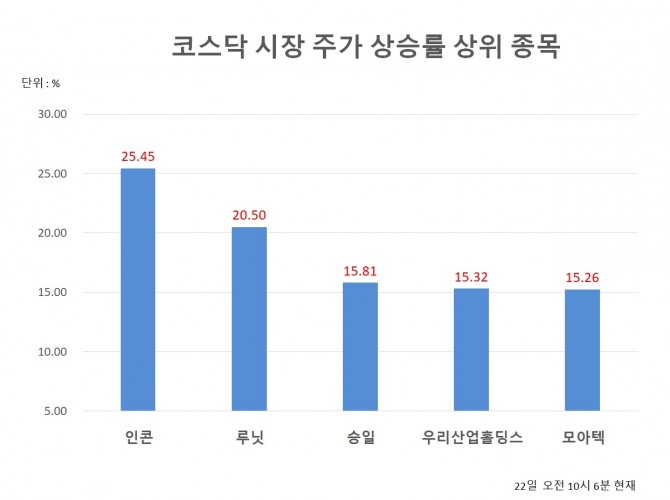 22일 오전 10시 6분 현재 코스닥 상승률 상위 30개 종목은 다음과 같다.