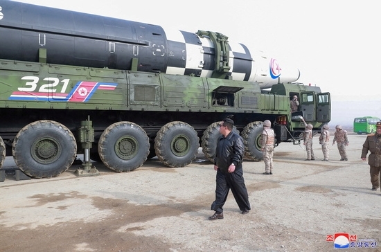 김정은 북한 국무위원장이 차에 실려 있는 대륙간 탄도 미사일을 시찰하고 있다. 사진=로이터