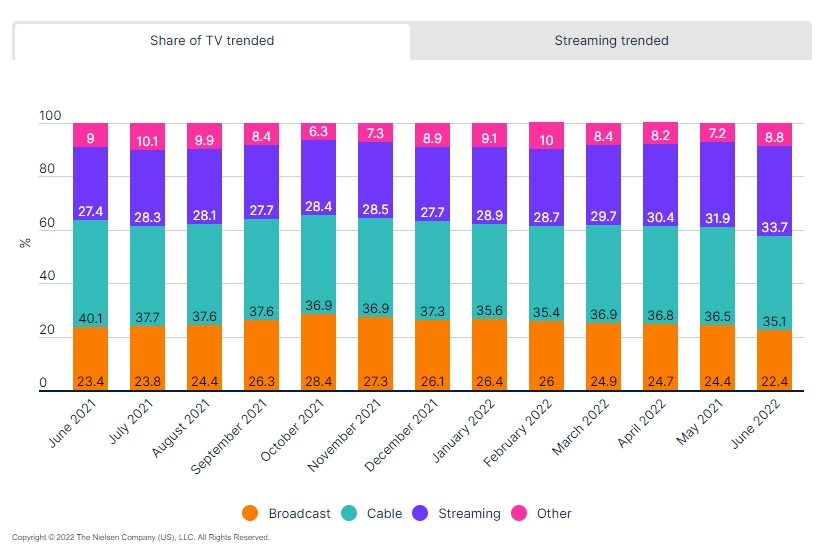 구체적으로 닐슨이 지난달 조사한 결과에 따르면 공중파 TV의 시청률이 22.4%를 차지한 가운데 케이블TV가 35.1%, OTT와 유튜브를 포함한 스트리밍 서비스가 33.7%를 각각 기록했다.