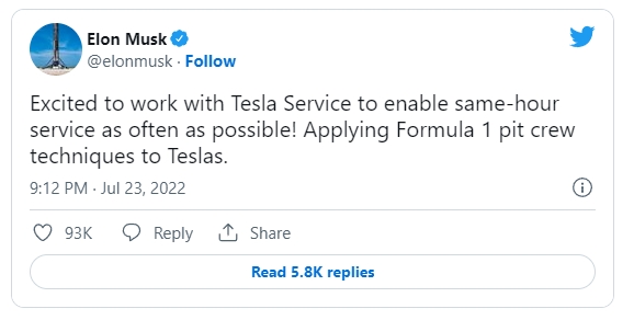 한편, 1시간내 즉시 수리 서비스는 구호에 가까울 가능성이 크다는 지적이다. 머스크 스스로가 테슬라 서비스센터에 들어오는 수리 요청건수의 3분의 2를 당일내 처리할 수 있도록 노력하겠다는 계획을 이미 밝힌 바 있기 때문이다.