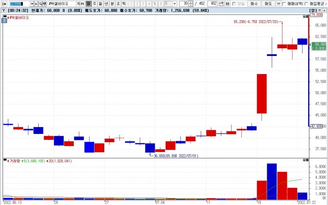 1위 박셀바이오 6만800원 +19100원 (45.8%), 2위 에이에프더블류 3985원 +715원 (21.87%), 3위 엔젠바이오 9700원 +1310원 (15.61%), 4위 자이언트스텝 2만6050원 +3400원 (15.01%), 5위 아이센스 3만5900원 +4400원 (13.97%)