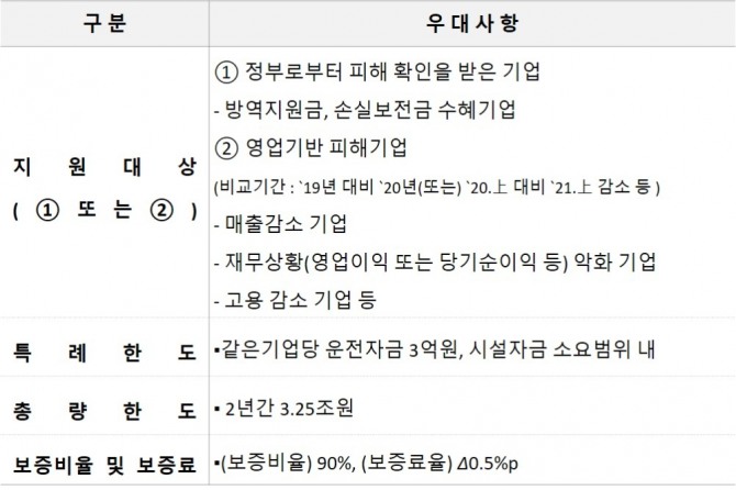 정부는 방역지원금 또는 손실보상금을 받은 기업과 코로나19 장기화로 인해 매출이나 영업이익 감소 등 영업기반 피해기업까지 포함해 자금지원에 소외되는 기업이 없도록 폭넓게 지원할 계획이다.