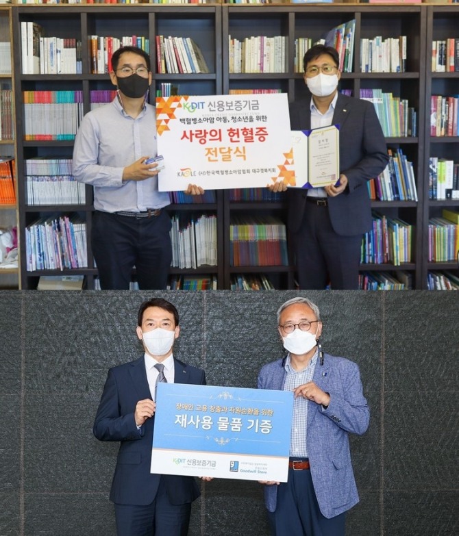 지난 20일 신용보증기금 정현호 미래전략실장(오른쪽)이 한국백혈병소아암협회 정민철 대구경북지회장(왼쪽)에게 헌혈증 전달하는 모습(위)과 지난 28일 김충배 전무이사(왼쪽)가 밀알복지재단 한상욱 굿윌본부장(오른쪽)에게 재사용 물품 기부 후 기념촬영을 하는 모습(아래) [사진=신용보증기금]
