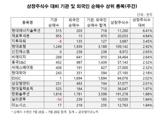기관과 외국인이 한주간 현대에너지솔루션을 사들인 규모는 상장주식수의 6.41%에 해당한다. 이는 기관과 외국인투자자 합산 기준으로 상장주식수 대비 비중확대 1위에 해당한다.