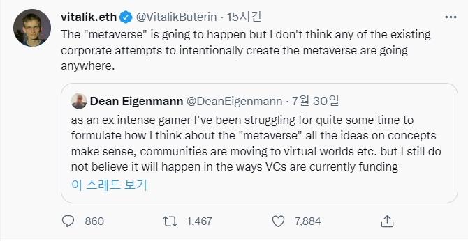 캐나다 프로그래머 부테린은 딘 엔진맨(Dean Eigenmann)의 "메타버스 개념에 대한 아이디어가 논리적이기는 하지만 벤처 캐피탈 자금을 통해 실현될 것이라고는 믿지 않는다"고 말한 것에 대한 응답으로 이같이 말했다.
