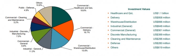헬스케어 분야가 로봇 산업에 가장 많은 투자를 했지만, 배송 및 창고 업종은 그리 뒤떨어지는 수준이 아니다. 배송 라인에 2021년에 9억 5천 8백만 달러의 투자를 한 반면, 창고 및 유통 라인에는 8억 9천 6백만 달러가 지원되었다.